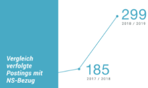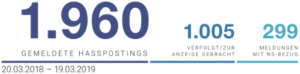 Insgesamt gingen bei der Stelle innerhalb eines Jahres 1960 Meldungen (20. März 2018 bis 19. März 2019) zu vermeintlichen Hasspostings primär aus Österreich ein. 1005 Hasspostings wurden an die zuständigen Stellen weitergeleitet bzw. zur Anzeige gebracht. Davon betrafen wiederum 299 Meldungen (29,75 Prozent) das Verbotsgesetz oder wiesen einen antisemitischen Inhalt auf – das bedeutet eine Steigerung in dieser Kategorie gegenüber dem Vergleichszeitraum 2017/2018 um 61 Prozent.