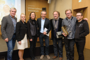 V.l.n.r.: Gerhard Draxler (ORF Steiermark), Daniela Grabovac (Antidiskriminierungsstelle), Landesrätin Bettina Vollath, Gernot Rath (ORF), OPUS mit Herwig Rüdisser, Ewald Pfleger, Kurt René Plisnier.© Arno Friebes