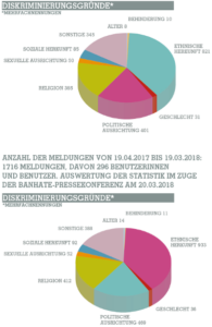 Das vergangene Jahr war für die Antidiskriminierungsstelle Steiermark ein besonderes: 2017 wurden insgesamt 2139 Anfragen und Meldungen an die Stelle gerichtet – beinahe eine Verdreifachung (+272%) im Vergleich zum Jahr 2016. Maßgeblich verantwortlich für diesen Anstieg war die Einführung von „BanHate“, der ersten mobilen App, mit der Hasspostings plattformunabhängig auf sozialen Netzwerken und anderen Medien gemeldet werden können. Zu den 1500 Meldungen, die im Jahr 2017 über „BanHate“ aus ganz Österreich und vereinzelt auch aus Deutschland an die Stelle herangetragen wurden, sind es vor allem aber die 639 regionalen und direkt an die Antidiskriminierungsstelle gerichteten Anfragen, die eine Einschätzung zur Diskriminierung in der Steiermark möglich machen.